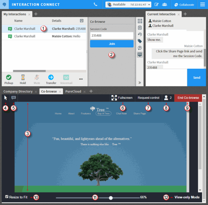 Pour rejoindre une session co-browse, vous devez disposer d'une interaction sélectionnée et connectée. |