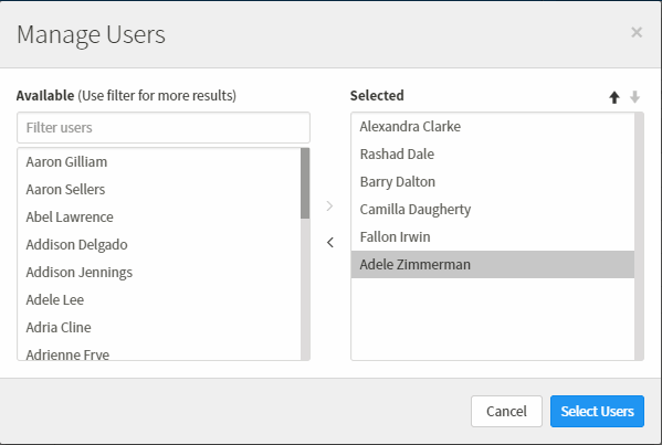 Dans la boîte de dialogue Gérer les utilisateurs, sélectionnez l'utilisateur que vous ne souhaitez plus surveiller dans la liste Sélectionné, puis cliquez sur< pour faire revenir le nom dans la liste Disponible.