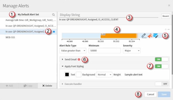 Utilisez cette boîte de dialogue pour ajouter, modifier, copier et supprimer des alertes. Vous sélectionnez une statistique, définissez les conditions de l'alerte et, éventuellement, sélectionnez une ou plusieurs actions à déclencher lorsque l'alerte se produit.