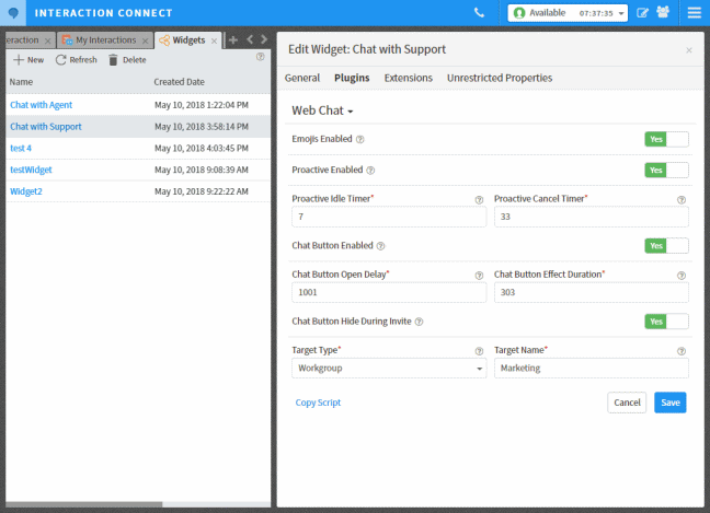 Remarque : le paramètre Ajouter/Supprimer des plug-ins de la page de configuration générale de widgets détermine les plug-ins disponibles sur cette page. Vous pouvez ajouter des sections spécialisées à cette page dans la mesure où PureConnect prend en charge des types de widgets Genesys supplémentaires.