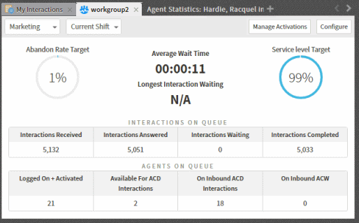 Astuce : si vous disposez de la licence Interaction Supervisor Plug-in : Groupes de travail, vous pouvez sélectionner et organiser les statistiques dans cette section. Consultez la rubrique Affichage et configuration de la vue Statistiques de groupe de travail. |