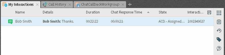 Le chat sélectionnée détermine la session de chat qui apparaît dans la vue Interaction actuelle. L'interaction de chat actuellement sélectionnée est mise en surbrillance.