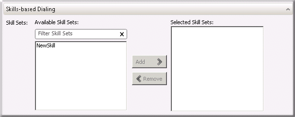 This list contains the names of Skill Sets that this campaign will evaluate when selecting records from the contact list. To disable skills-based dialing for a campaign, move all entries to the list on the left.