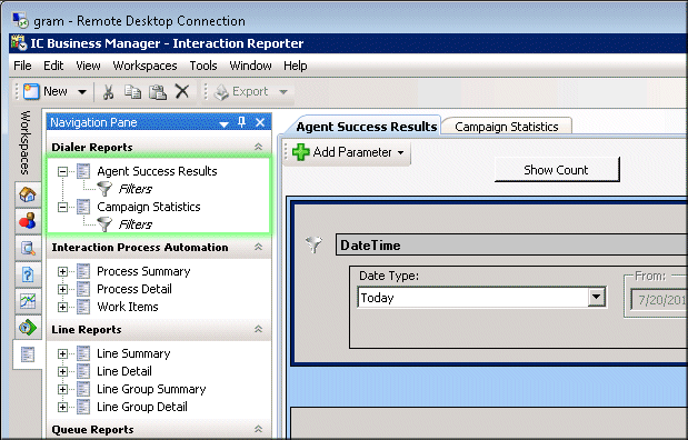 Dialer reports run in IC Business Manager's Interaction Reporter module. Interaction Reporter allows managers to run pre-defined reports, using filters to configure report parameters. Report Filters can be saved to run reports again. Users can annotate, print, and export any report.