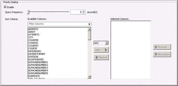 Settings for Priority Dialing are managed for Campaigns in the Priority Dialing frame: