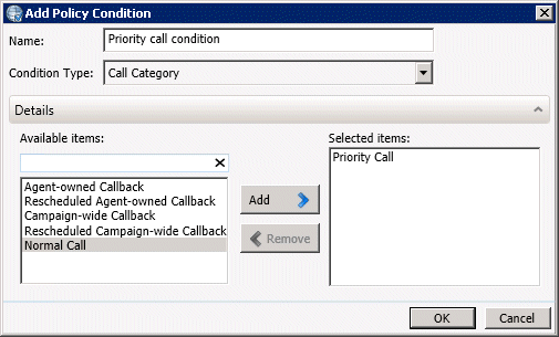 Item Condition configuration allows a policy to examine call category