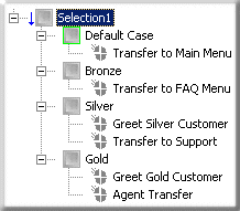 The figure at left shows Expression Case nodes below the Selection action and displays child operations to perform for each possible case. In this example: Default Case: If the value of the attribute is not Bronze, Silver, or Gold, the Default Case expression case is selected, which in this example transfers the interaction to a Main Menu. Bronze: An expression case was created to transfer Bronze interactions to a FAQ menu. Silver: An expression case was created to direct the system to send Silver interactions (in this example, calls) a customized greeting message on their way to the Support queue. Gold: An expression case was created to direct the system to transfer Gold interactions (in this example, calls) to an Agent's queue after first receiving their own custom greeting. |