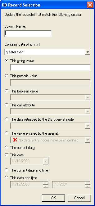 This option compares the column identified by Column Name to a string of data collected by a caller data entry operation.  Be careful using this option.  It can potentially allow users to delete records based upon a wide range of selection criteria.