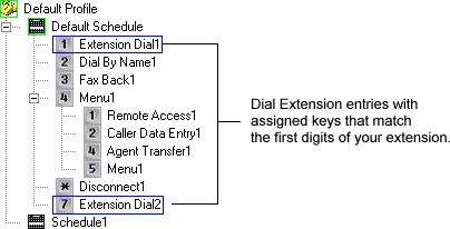 Once you've identified the numbers that start extensions, you should add an Dial Extension entry with an assigned key for each of these numbers. This is shown in the following diagram.