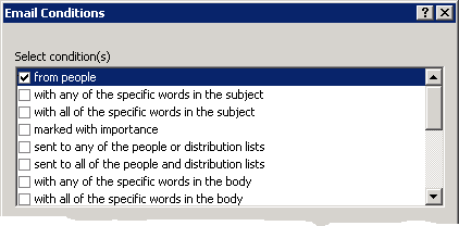 Compares contents of the From and CC fields in a message to addresses or distribution lists you specify using the Specify Search Words or Phrases dialog. A match is found when any people or distribution lists match your search criteria.