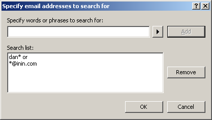 Compares email addresses in the From and CC fields to addresses you specify using the Specify Search Words or Phrases dialog. A match is found when any email addresses match your search criteria.
