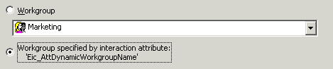 This option allows you to select a specific workgroup by the workgroup ID contained in the interaction attribute ‘Eic_AttDynamicWorkgroupName’ and defined for the server. This is particularly helpful in environments which contain a large number of workgroups, thereby making it cumbersome to select the appropriate workgroup. For example, you can organize workgroups according to area of expertise, such as web service calls, customer handler calls, etc., and assign names to the workgroups that help identify the specific skill. Then, you can place the workgroup name in the interaction attribute ‘Eic_AttDynamicWorkgroupName and use that attribute for a workgroup transfer operation..