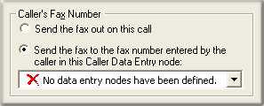 This option identifies the Caller Data Entry node that acquires the destination telephone number to Fax. The Fax Back operation itself does not prompt the user to enter a telephone number. You must collect this information using a Caller Data Entry node before invoking Fax Back.