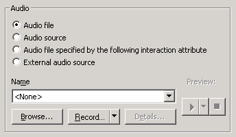 The options in this frame determine whether audio is played from an Attendant .wav file, audio sources defined in Interaction Administrator, or an audio file specified by a specific interaction attribute.