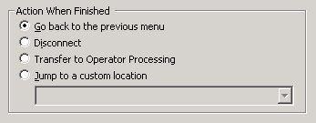 These options set the processing that occurs after the operation completes successfully, when flow of control leaves the node. You can return control to the previous menu, disconnect the call, transfer to an operator profile, or jump to any node or action that has been defined for the current server.
