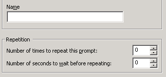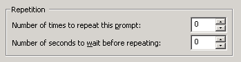 If you click Audio Files, the embedded audio controls allow the selection of an Attendant .wav file, and additional options are presented in the Repetition frame. Repetition settings optionally replay the prompt to the caller. By default, the prompt plays once, and is not repeated.