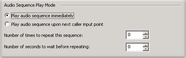 The audio sequence plays immediately when the action is reached in the IVR tree. In Immediate mode, you can configuration of number of times to repeat sequence and the amount of time to wait in between.