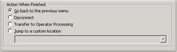 This option allows you to jump to any profile, schedule, menu, or operation that is defined for the current server. Flow of control will pass to this destination once the wave file has been played the number of time specified by the repeat value.