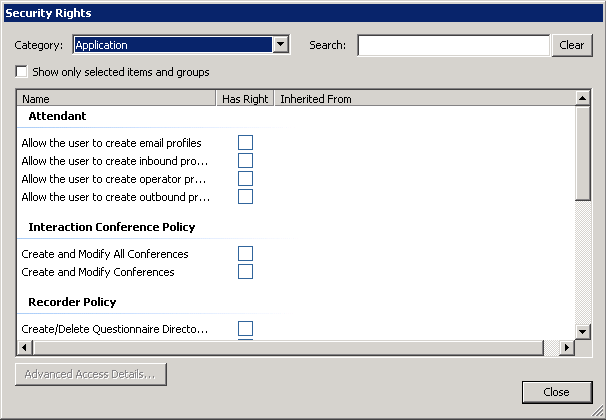 The right to view or modify Attendant configurations is configured outside of Interaction Attendant, in Interaction Administrator. Rights to view, search, or modify a call flow can be assigned at the Default User, Role, User, or Workgroups level. Rights are managed on the Access Control dialog box, located from the Configuration-->Security tab-->Access Control button in Interaction Administrator. The table below lists Access Control List (ACL) rights that pertain to Interaction Attendant.