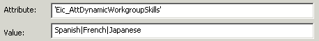 Eic_AttDynamicWorkgroupSkills. Defines a skill set based on two or more defined skills. The skills designated in this attribute must be separated using the pipe-delimited format. For example, if you want to specify that agents assigned to this interaction attribute contain multiple language skills, enter the value for this attribute as “Spanish|French|Norweigian”.