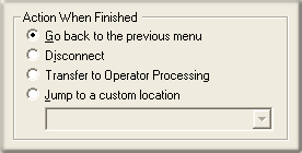 These options set the processing that occurs after the operation completes successfully, when flow of control leaves this node. You can return control to the previous menu, disconnect the call, transfer to an operator profile, or jump to any node or action that has been defined for the current server.