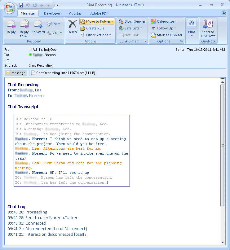 With the appropriate licenses and rights, you can record a chat session between other CIC client users (intercom chat) or between you and remote chat participants (web chat). Recording a chat session creates a transcript of the chat.
