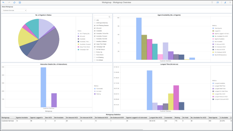 CX Insights displays interactive dashboards that you can use to explore agent data and the current state of your contact center. Visual representations, called visualizations, present the data in the dashboard, for your interpretation. Depending on the dashboard you are viewing, different visualizations are available to analyze your data.