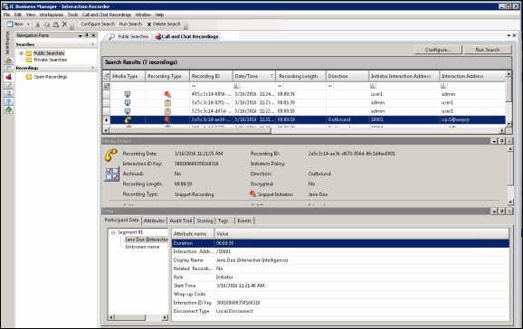 Run a Recording Search to display a list of recorded interactions, of your Search results, in the Workspace. Specific details of interactions can also be reviewed in this view.