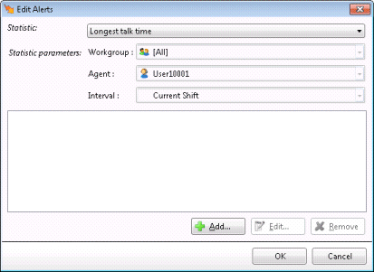 Fill in statistic parameters as needed. The appearance of the Add/Edit Alert dialog varies, since statistics use parameters to quantify what the statistic displays information about. For example, a statistic for Longest Talk Time has three parameters: workgroup, agent, and period interval (such as current shift). In this case, parameters scope the Longest Talk Time statistic to a particular agent, workgroup queue, and time frame. Other statistics require different parameters.