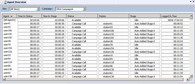 The Agent Overview compares the performance of multiple agents across sites and campaigns. This view displays the current activity of agents, such as each agent's current status, current stage, time in status, and other Dialer Agent Statistics, such as time in stage. As with most views, you can click a column header to sort by that column.