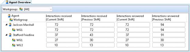 The Agent Overview summarizes Agent Statistics of several agents in one or more workgroups. Statistics can be expanded to show activity in each workgroup the agent participates in.