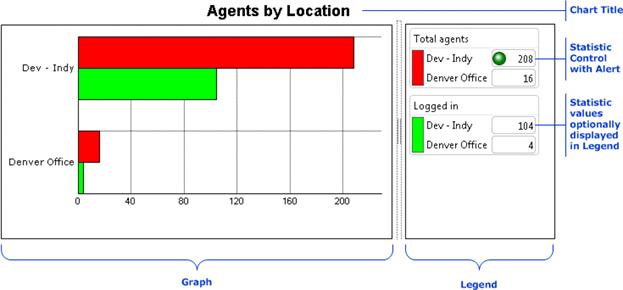 Chart controls are used by graph views to render statistics as column, bar, or line graphs. The graph portion of the chart presents the relation between different system statistics selected by the user for comparison. The optional legend displays statistic values and active alerts.