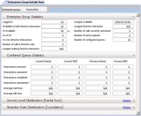 Interaction Director makes intelligent routing decisions that helps balance loads across CIC sites, meet service goals, and increase customer satisfaction. This view displays service level, abandon and queue statistics about an Enterprise Group. Enterprise Groups are logically related queues that conceptually represent the target destination of a routed call.