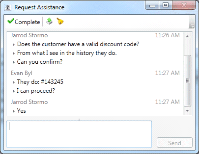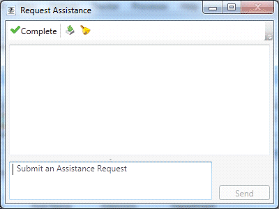 The agent clicks Send. Afterward the agent can monitor the status of the request in the Request Assistance dialog to see if a workgroup supervisor will assist with the interaction.