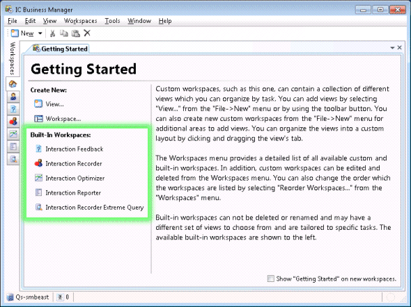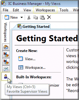 For more information about Workspaces and adding views, select Getting Started from the Help menu to open the IC Business Manager User Interface Help.