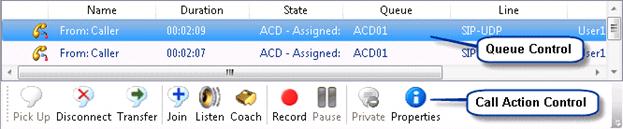 Where applicable, a Call Action control below the queue control allows a supervisor to select a queue object, and then listen, coach the agent, record the conversation, join a conference, or perform basic telephony operations.