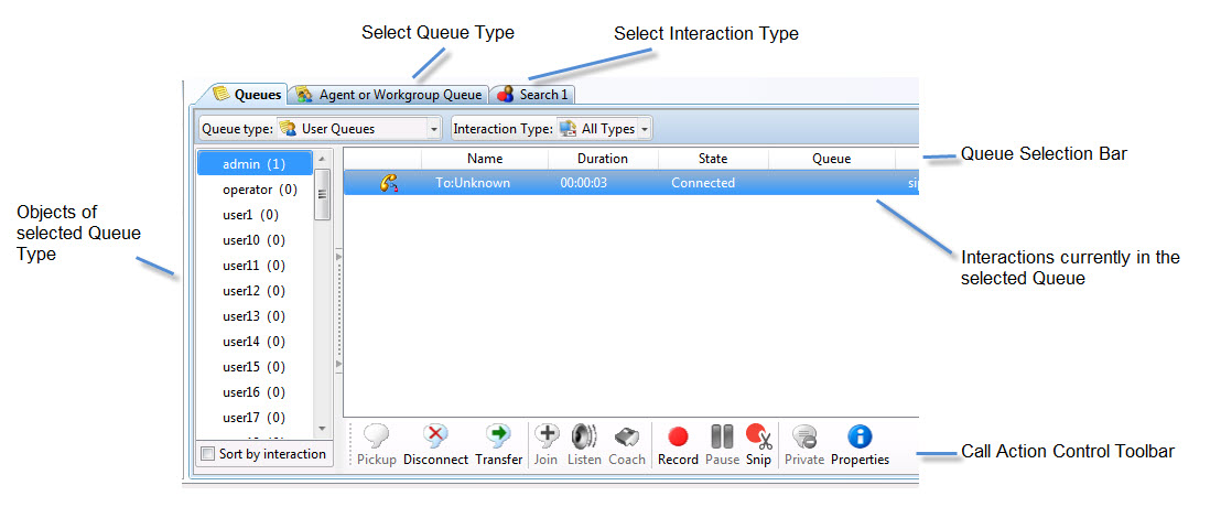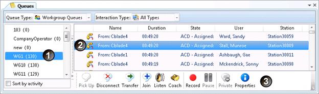 A queue is collection of interactions related to a user, station or workgroup. The Queues view allows a supervisor or manager to examine activity in line, station, user and workgroup queues.  Interactions can be picked up, disconnected, placed on hold, joined, listened to, coached, recorded, or tagged as private.  From this view, Agents can be given assistance with interactions in the different queues.