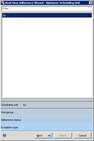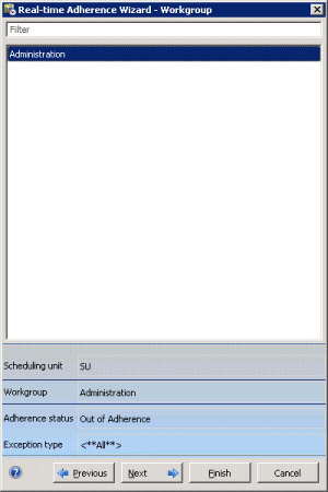 The Real-time Adherence wizard appears a Real-time Adherence view is added. Pages in this wizard prompt for Interaction Optimizer Scheduling Unit, Workgroup, Adherence Status, and Exception Type.
