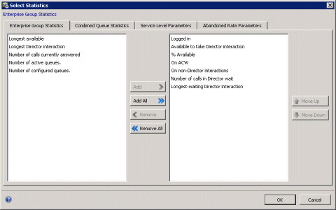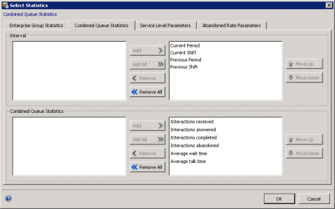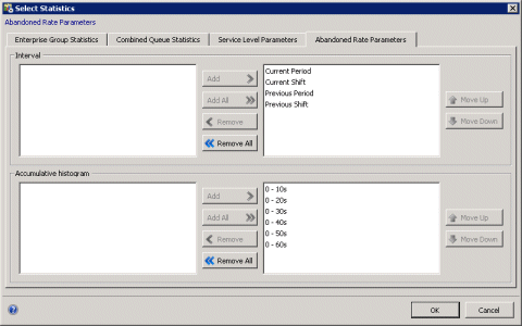 This dialog has multiple tabs used to select statistics, periods, and histogram intervals for service level and abandonment rate. The Add and Remove buttons move a selection from one list to another. Add All and Remove All move all items from one list to another. OK applies changes and dismisses the dialog. Cancel dismisses the dialog without applying changes.