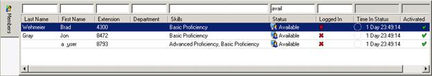 A right click context menu item (Display Skill Set) displays the entire list of skills, their proficiency and the desire to use them. If a user has the same skill in two different workgroups with different proficiency and desire to use, they will both appear in the user skills dialog box. Filter capability is provided. If you type a filter string at the top of the column, only the agents with the filtered skill will appear. The filter is case independent. When the directory is paged, the filtering is done by the server, otherwise it is done locally. Skills display is dynamic in the contact directory list and static in the user list skills dialog box. |