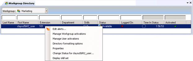 A Workgroup Directory view displays the status of individual workgroup members, including the length of time in status and their logged in state. You can filter for specific values by typing in text boxes above each column.