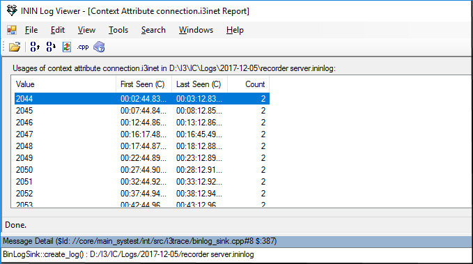 The Tools > Analyze Distinct Context Attribute Values command allows you to select a context attribute from a list, and view the value of that attribute in all instances contained in the log file. For example, if you click Analyze Distinct Context Attribute Values > connection.i3inet on the Tools menu, Log Viewer lists all instances of this attribute: