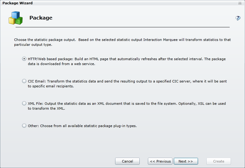 On this page of the Package Wizard, you will select the output type that you want to use for your package.