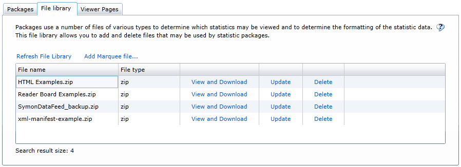 The File Library tab displays all the XSL File sets that currently exist in your Marquee installation. This includes the examples that came with Marquee and any files that you have created. An XSL File set consists of files that are used to define the display of the statistics on the various output devices that Marquee supports. As you can see, the XSL File sets are stored in .zip archive files. You will also notice that the File Library tab provides access to several file management commands that you can use to manipulate these files.