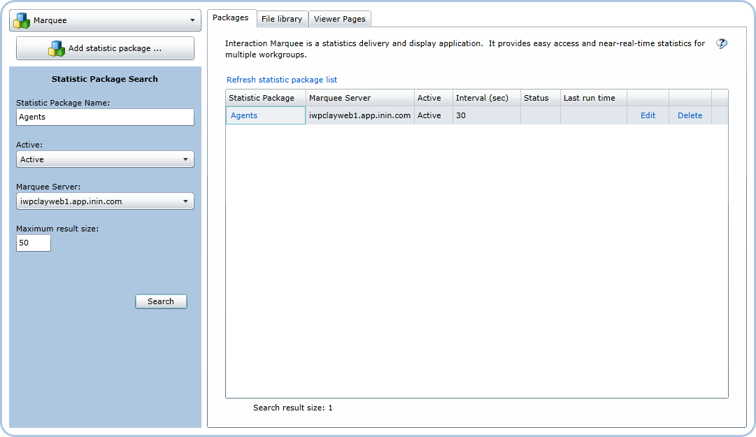 If work with a lot of different statistic packages and more than one Marquee Server, you may find that it is difficult to locate a specific package on the Packages tab. If so you’ll want to take advantage of the Statistic Package Search panel on the Marquee home page.