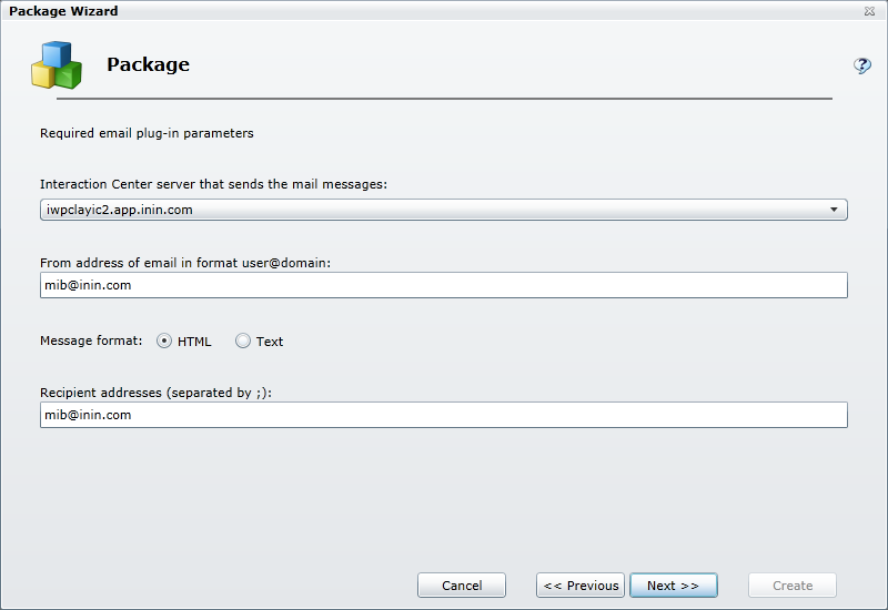 When you select the CIC Email package output format, the Package Wizard will display the first of two pages titled Required email plug-in parameters. On this page you will begin to specify the email message configuration.