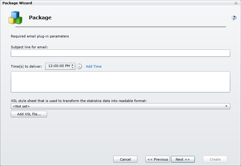 When you click Next, the Package Wizard will display the second Required email plug-in parameters page. On this page you will complete the email message configuration, choose delivery times, and then specify the XSL File set that you want to use to create the display for your statistic package.