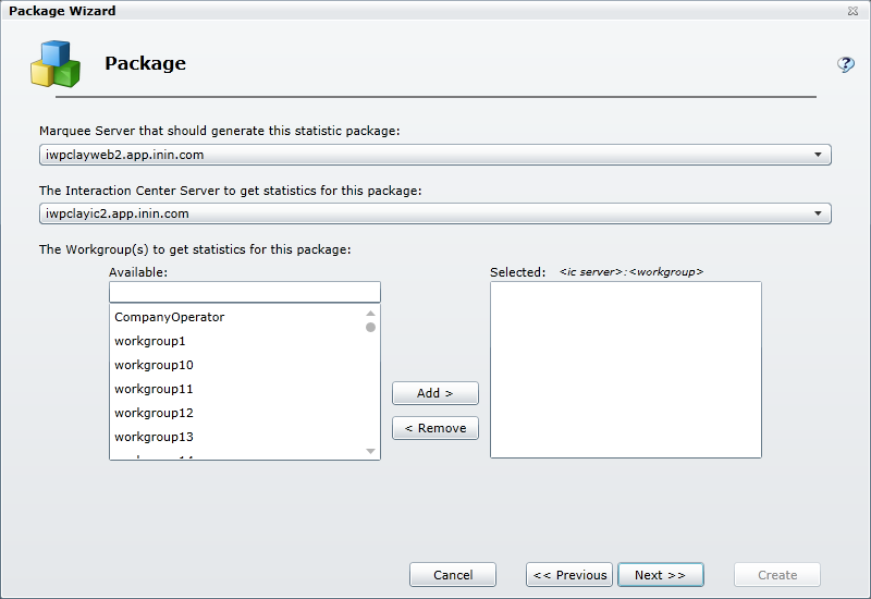 On this page of the Package Wizard, you will select the workgroups and servers that will provide and generate the statistics for the package.-