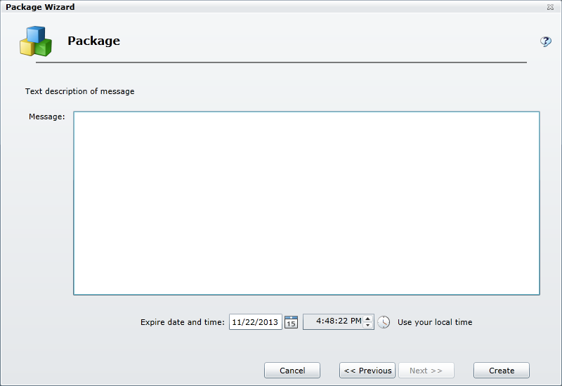 When you click Next, the Package Wizard displays the Text description of message page where you can enter a message that you want to display along with your package. You can also choose how long the message will display by choosing an expiration date and time.View this page