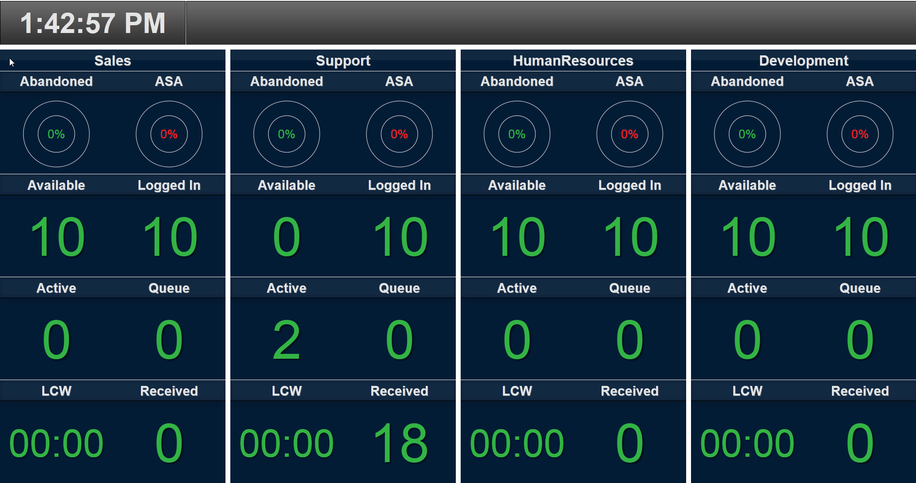 Note: The Marquee display page shows the statistics across the selected workgroups. In this example, the statistics shown are: Abandoned, ASA (Average Speed to Answer), Available, LCW (Longest Call Waiting), Active, Queue, and Received. The user can choose to display any statistics that are being collected.